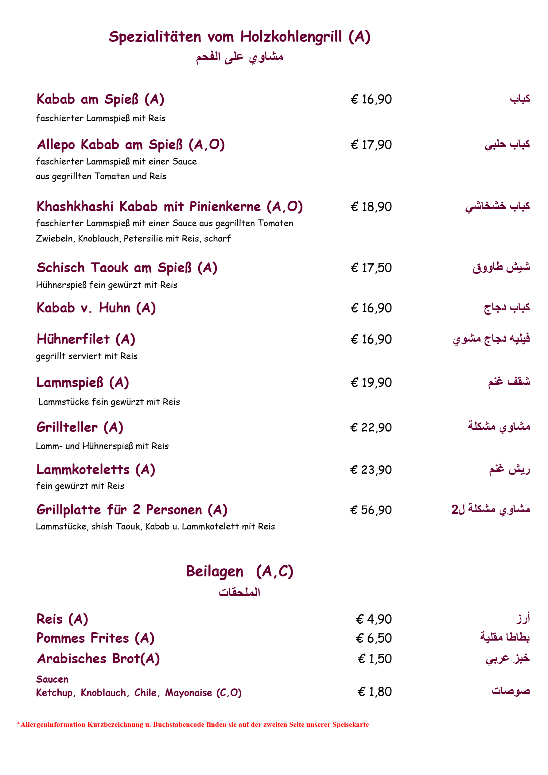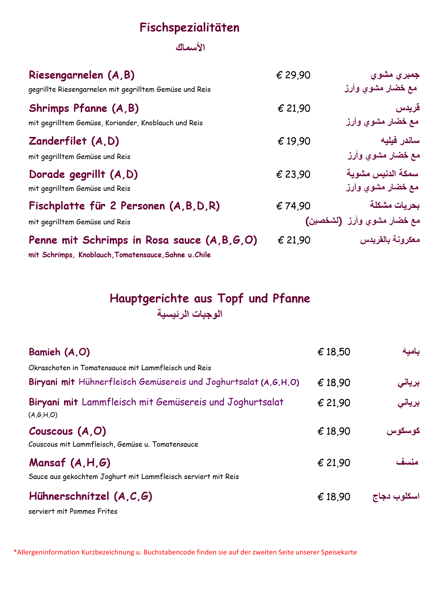 واسعة من المقبلات الباردة والساخنة، والمشاوي، والأطباق الشرقية، والتخصصات والحلويات اللذيذة